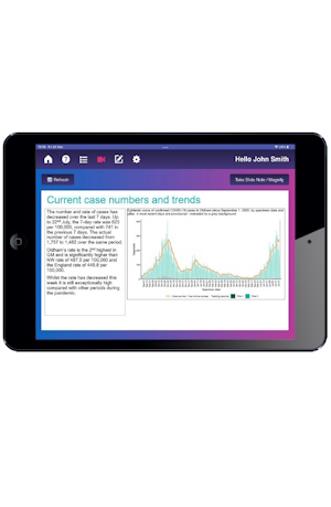 Watch presentations on the iPads. Slides change in sync with conference screens.
